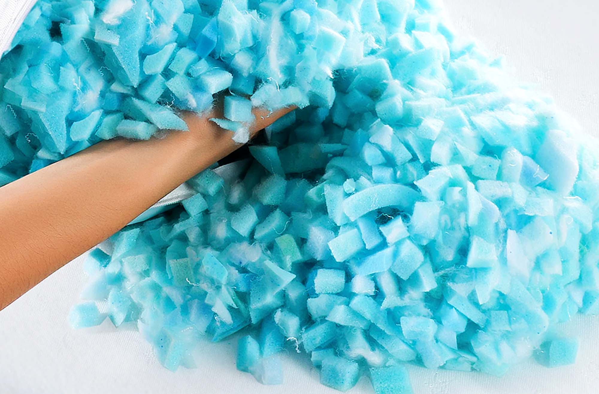 2,2 kg formbarer blauer Memory-Schaum-Chips für anpassbare Höhe, konturierte Unterstützung und verbesserte Atmungsaktivität.