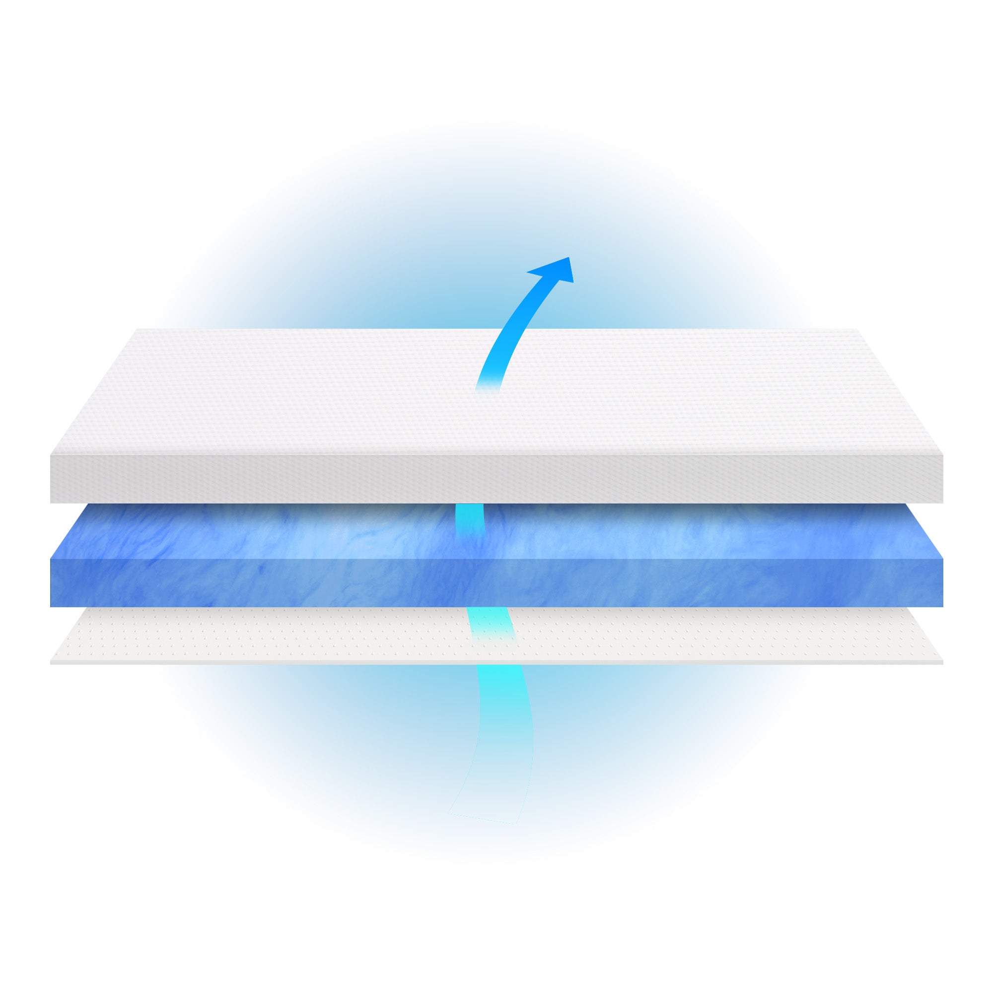 Bleiben Sie frisch und trocken. Die offenzellige Schaumstruktur und der atmungsaktive Bezug fördern die Luftzirkulation und verhindern so die Ansammlung von Wärme und Feuchtigkeit.